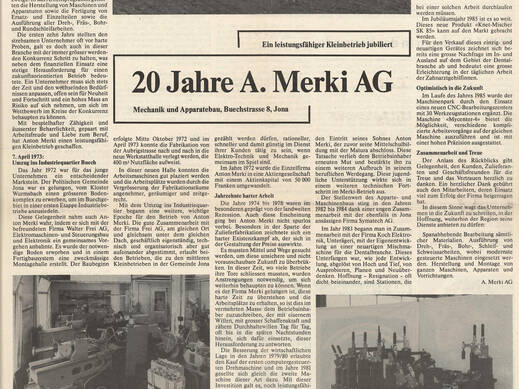 Die A. Merki AG ist ein Kleinbetrieb mit aktuell 7 Mitarbeiter/Innen und 2 Lernenden. Unsere Firma wurde 1965 gegründet und feiert im Jahre 2025 ihr 60-jähriges Bestehen.