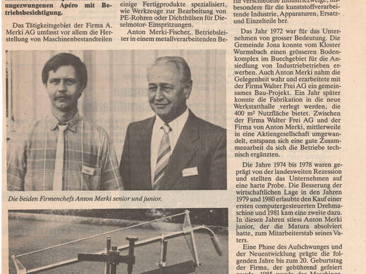Unsere Firma wurde im Jahre 1965 als Einzelfirma von Anton Merki gegründet. Im Jahre 1972 wurde die Firma in eine Aktiengesellschaft umgewandelt und 1973 durften wir in den neu erstellten Bau am heutigen Standort einziehen. Der Firmengründer zog sich im Jahre 2000 aus dem Alltagsgeschäft zurück und übergab die Führung seinem Sohn Toni Merki.